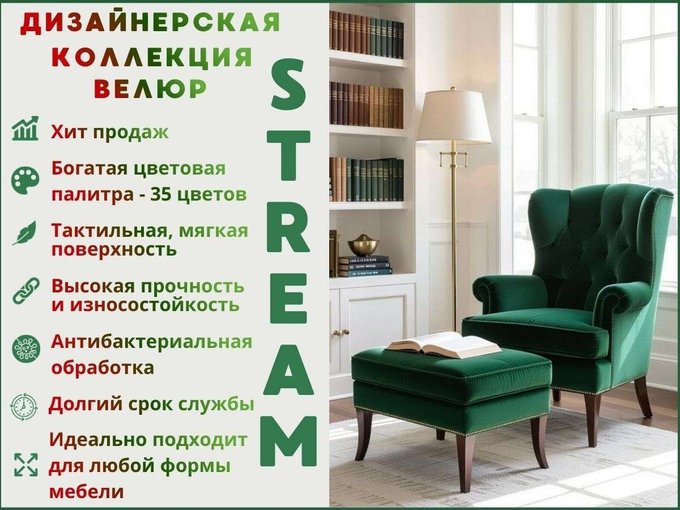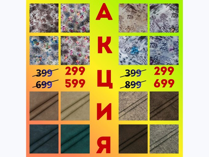 В торговых залах представлено более 300 коллекций тканей, свыше 3000 цветодизайнов ( велюр, флок, шинилл, жаккард, терможаккард, искусственная замша, эко-, винил-, искусственная и натуральная кожа) в наличие и под заказ.